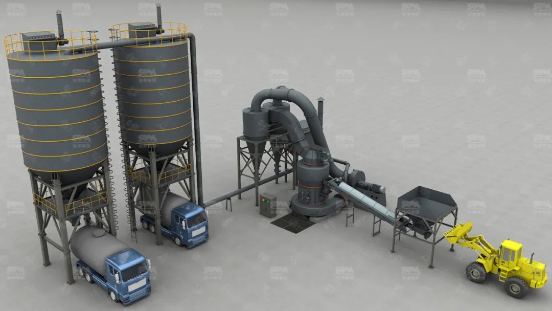 原料經變頻皮帶給料機均勻定量連續地送入主機磨室內進行研磨。粉磨后的物料被風機氣流送入選粉機進行分級,在分析機的作用下,不符合細度要求的物料落入磨室內重新碾磨,合格的物料則隨氣流經管道進入旋風集粉器內,進行分離收集,經排料裝置排出即為成品粉體。分離后的氣流通過旋風集粉器上端回風管進入風機。該生產系統在負壓密閉條件下運行,并配有脈沖除塵器無粉塵外溢,符合國家環保標準。